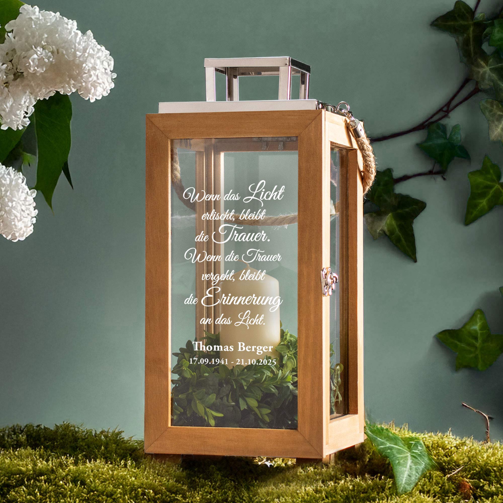 Auf der vorderen Glasscheibe ist der bewegende Text graviert: "Wenn das Licht erlischt, bleibt die Trauer. Wenn die Trauer vergeht, bleibt die Erinnerung an das Licht". Ergänzt wird dieser durch den Namen und die Lebensdaten der verstorbenen Person – eingraviert in feiner Schrift, für eine ganz persönliche Note.
